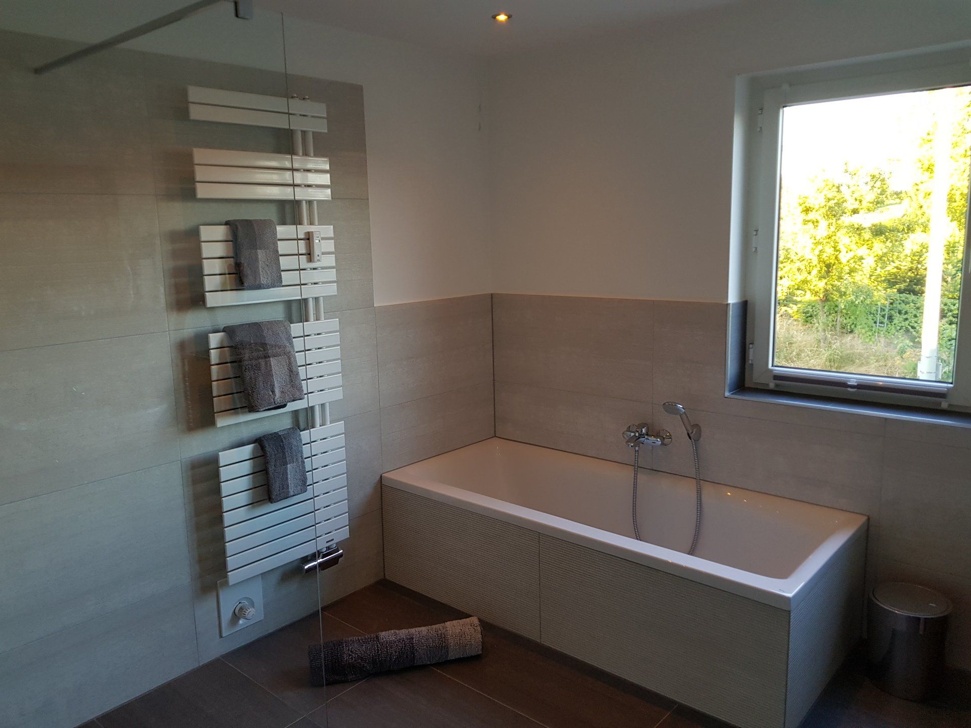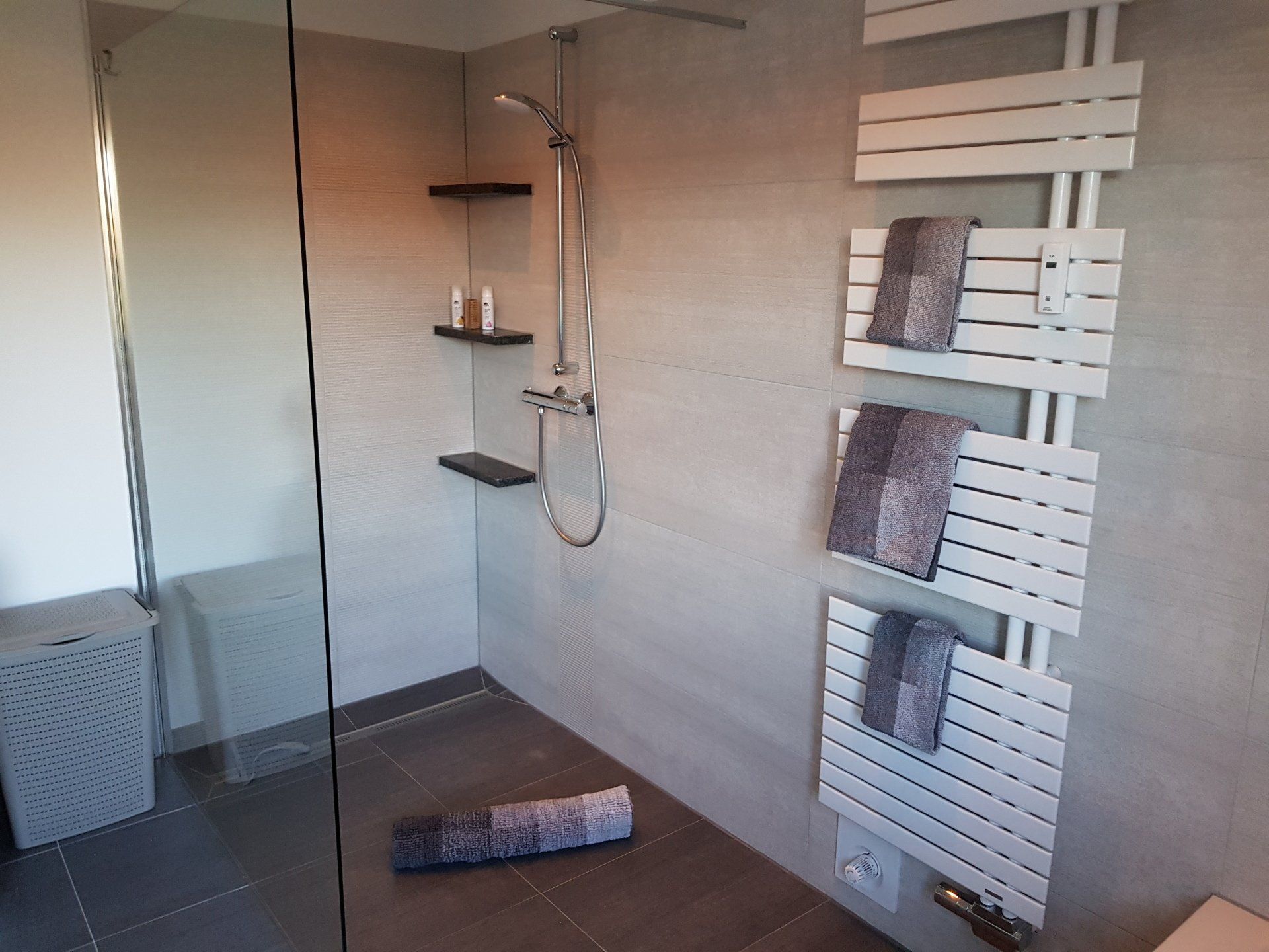 Das Badezimmer verfügt über eine begehbare Dusche, Badewanne, Waschbecken, WC und einen Föhn.