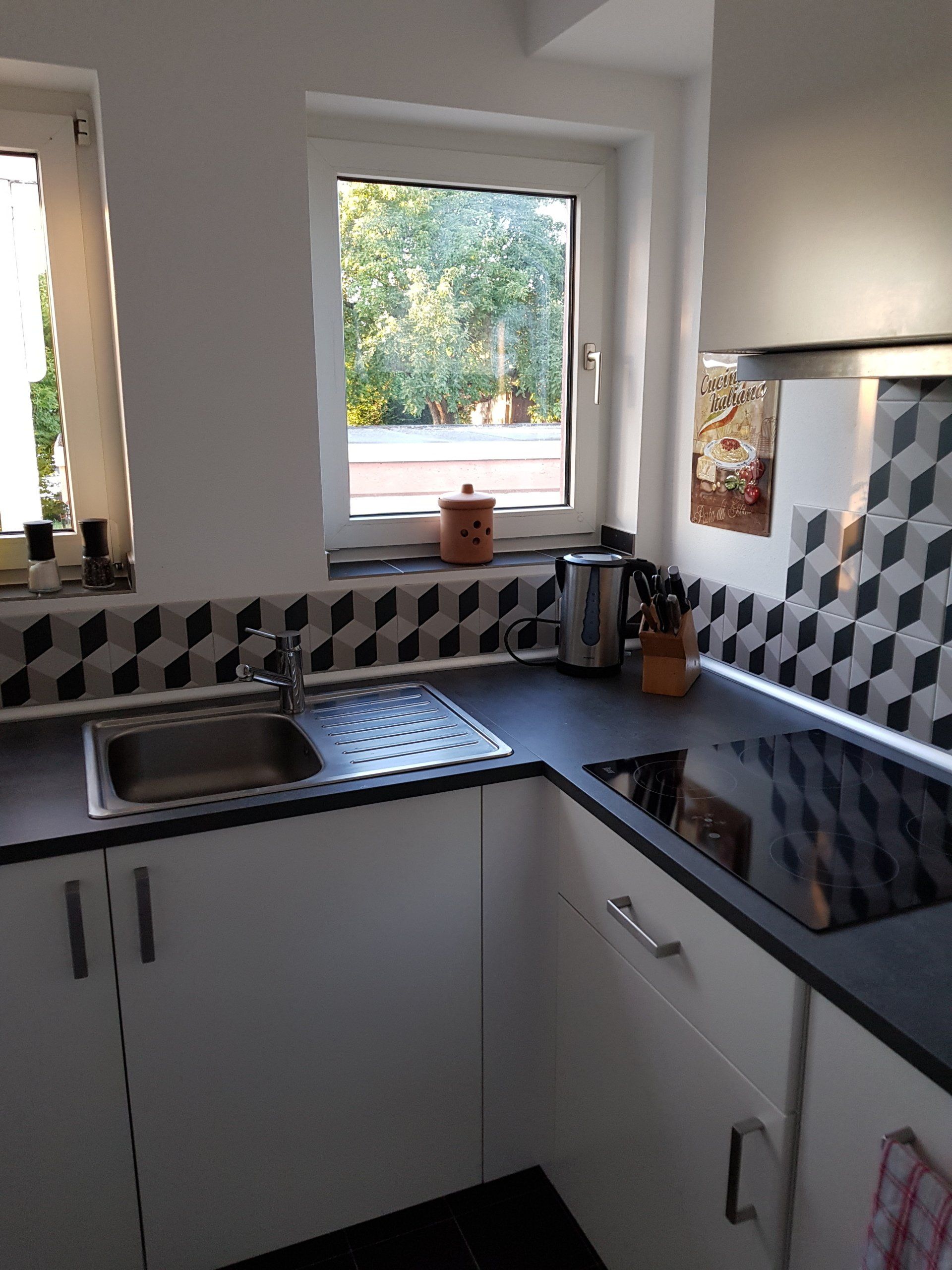 Die Küche ist mit einem Induktionskochfeld, Mini-Backofen, Spülmaschine, Kühlschrank inkl. Gefrierfach, Pad Kaffeemaschine & French Press, einer Grundausstattung an Kochutensilien und Geschirr ausgestattet.